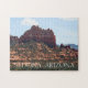 11” x 14” jigsaw puzzle with an image of a watercolor painting of a predominant and recognizable red rock formation close to the town of Sedona at the base of the Crimson Cliffs. The distinguished landmark is Snoopy Rock, a likeness to Snoopy the dog from the Peanuts cartoons.
