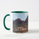 White and hunter green 11 oz. combo mug with an image of a watercolor painting of a predominant and recognizable red rock formation close to the town of Sedona at the base of the Crimson Cliffs.