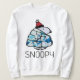 This classic sweatshirt features the beloved Snoopy character prominently displayed in the center. The graphic shows Snoopy dressed warmly for cold weather in a puffy winter coat patterned with a striking blue and white geometric/mosaic design, and topped with a red and white knit cap. Set against a white background, this sweatshirt is a fun and comfortable apparel item, perfect for everyday wear, or as a stylish seasonal layer during the winter months.