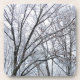 Snow-covered branches fill the photograph making it almost an abstraction. In the foreground, a dark oak tree trunk splits into many limbs starting near the bottom left of the frame and reaching up and across to the right. The near black trunk provides a graphic element to the image. The oak tree still has quite a few brown leaves on it. The sky in the background is white. A chaotic and intriguing winter scene.