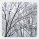 Snow-covered branches fill the photograph making it almost an abstraction. In the foreground, a dark oak tree trunk splits into many limbs starting near the bottom left of the frame and reaching up and across to the right. The near black trunk provides a graphic element to the image. The oak tree still has quite a few brown leaves on it. The sky in the background is white. A chaotic and intriguing winter scene.