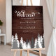 Amaze your guests with this rustic wedding welcome sign featuring beautiful pine trees with modern typography against a barn wood background.