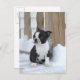 Boston terrier on the deck in the snow