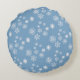 This fluffy round throw pillow has two looks--little white snowflakes on a foggy-day blue background on one side, and a scattering of bigger flakes on a deep evening blue background on the other. Perfect for snuggling up by a cozy fireplace day or night.