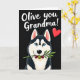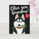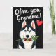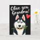 This card features a cartoon-style snow dog on a deep black background, creating a cozy, close-up feel ❤️. The dog’s head fills the lower two-thirds, with bright blue eyes and a soft, affectionate look that feels like a friendly nuzzle. Its fur is white around the muzzle and chest, shaded with charcoal and cool gray along the ears and face for extra depth. In its mouth, the dog holds a small olive branch like a sweet offering, with two olives—one green and one dark reddish-purple—adding a romantic little wink to the scene. Across the upper area, the phrase “Olive you Grandma!” appears in flowing white lettering, centered and easy to read. A glossy red heart floats near the upper right, balancing the text and drawing the eye upward 🌼. The heart has a bright highlight, and the branch angles slightly upward from left to right.