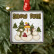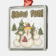Snow Fun keepsake ornament features three adorable snowmen and evergreen trees and text that reads "Snow Fun!".