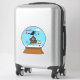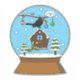 An illustration of a cute snow globe with blackbird singing on the top of a holly bird house hanging on a barebranch with colorful christmas balls in a snowy landscape and pine trees. This cute cartoon bird design is a gift idea for Christmas or xmas lovers and winter holiday lovers.