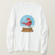 An illustration of a snow globe with a cute red cardinal wearing a red santa claus bonnet under a snow in a bright blue sky. This cute cartoon christmas waterglobe design is a gift idea for winter holiday lovers and, bird and animal lovers.