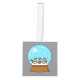 An illustration of a cute snow globe with three owl gnomes wearing a colorful santa hat in a snowy landscape with a pine tree. One of the owl gnomes is holding an axe. This cartoon snowdome or waterglobe Christmas design is a gift idea for birds lovers, xmas and winter holiday lovers.