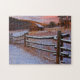 This photo features a snow covered rustic barn in front of a beautiful sunset on a Colorado ranch.