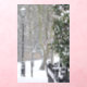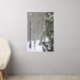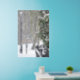 Wall decal with photo of winter scene with falling and lying snow, iron railings and green ivy in foreground, old-fashioned street light and trees and brick wall in background
