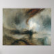 This is a reproduction of “Snow Storm - Steam-Boat off a Harbor’s Mouth”of 1842 by Joseph Mallord William Turner. He was sixty-seven years old when he created this painting. Turner was born in London and was sent to live with his uncle when his mother became mentally unstable. He began drawing at the ageof ten and his father sold them in his barber and wig shop. At fourteen he entered the Royal Academy of Art schools, and into the Academy itself the next year when he had his first exhibition. He traveled to Paris and Switzerland in 1802 and attracted several friends and patrons in his Twenties. He grew more eccentric with age and never married. He lived with his father for thirty years and, after his father’s death in 1829, he was subject to depression. He had at least two romantic liassons and died in 1851 at the house of his lover for eighteen years. This painting is an oil on canvas and measures 35.98 by 48 inches. It is in the Tate Gallery in London.