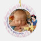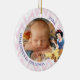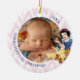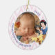This is a charming, rounded Christmas ornament, perfect for celebrating a baby's first holiday season. The ornament frames a sweet, personalized baby photo at the center, set against a background with a cute chevron pattern. The design is beautifully accented with Disney's Snow White character illustration, surrounded by her gentle woodland friends. The border is inscribed with personalized text commemorating a First Christmas and the specific year. This stunning piece is a delightful, lasting keepsake to mark a baby's first magical Christmas!