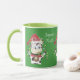 A fun mug to celebrate the Holiday Season with a Swiss little cow who is getting to decorate her house with her Christmas lights . It also says "Joyeux Noël" in white letters :)