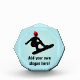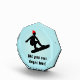 This snowboarding theme award can be personalized for a snow-sports enthusiast. The boarder is performing an aerial trick and wears a red winter hat in contrast to the bold black snowboard graphic. Add a funny slogan or a trophy-winner's name and event details. Either way, it's easy to customize this prize for your champion via the template. Use the Customize It link if you need to go further with lettering sizing or style.