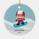 Personalize dated cute snowboard boy Christmas Ornament set on a mountain background.