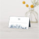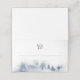 Chic winter wedding place card design features a watercolor scene of a snowy landscape dotted with pine trees in misty shades of blue and gray. Space provided for guest name and table number, topped with your initials worked into a monogram design with a decorative script ampersand. Designed to match our Snowbound wedding collection for elegant winter events.