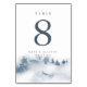 Wintry chic table number cards in soft shades of blue, gray and white feature a watercolor background depicting a snowy mountain scene dotted with pine trees. Personalize with each table number, with your names and wedding date beneath. Design repeats on reverse side. Coordinates with our Snowbound wedding invitation suite.