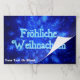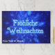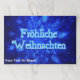 A swarm of blue fractal snowflakes. German text reading "Froliche Weihnachten" appears in glowing blue and white. Customize by adding your own additional text.