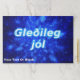 A swarm of blue fractal snowflakes. Icelandic text reading "Gleðileg jól" (Merry Christmas) appears in glowing blue and white.