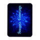 A wintry theme featuring a swarm of blue fractal snowflakes. Text reading "Season's Greetings" appears in glowing blue and white.