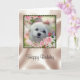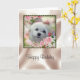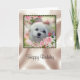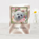 This cute Birthday Card features Snowdrop, a sweet little Maltese Dog. The image is a portrait of her face surrounded by spring flowers and pink roses in a pretty frame.