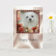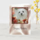 This Birthday Card features a portrait of Snowdrop, a sweet little Maltese Dog with some beautiful soft focus flowers and a fancy scalloped frame.