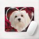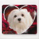A dramatic image of Snowdrop a sweet little Maltese. The pictures consists of a deep red silk background on top of which sits a diamond heart with a photograph of Snowdrop embellished by some lovely red roses.