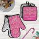 Personalize this faux glitter snowflake kitchen set - one pot holder and one oven mitt - in the Christmas color trend of pink, rich berry pink, for your own kitchen or as fun monogrammed gifts for family and friends. The complimentary designs bring these kitchen essentials together and the text templates make them one of a kind. The personalized pot holder has a jumbo smattering of pink snowflakes at the top hanging loop side which cascade downward towards the solid dark raspberry pink at the bottom. Two sets of text templates in white, one in a pretty script and one in a smaller simple modern font, let you customize a holiday greeting - Merry Christmas or Holiday Cheer - as well as a family name and year if you like. The personalized oven mitt is an all over pattern of faux sparkle pink snowflakes on the same rich magenta background with a stylized script font monogram initial in white at the top where the hanging loop sits. If you prefer your custom oven mitt without the monogram it is very easy to remove it before ordering. From everyday cooking and baking to simply being pretty to look at as party of your holiday kitchen décor, this personalized oven mitt and pot holder set makes a fun and thoughtful gift for the chef in your life.