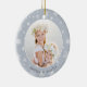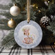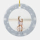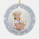 Festive photo Christmas ornament features a favorite photo on each side, framed by white snowflakes on a soft pastel background. Personalize with a custom caption on each side; shown with names and the year.