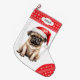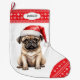 An adorable little Pug dog wears a red and white Santa hat on the front of this Christmas stocking. The image is placed on a white background, and the toe and top border are a red and white snowflake pattern. On the top border is a white label with your custom text in dark gray. The back of the stocking has the same red and white snowflake pattern.