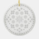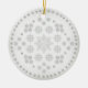 Add an elegant touch to your Christmas tree with this stunning ceramic ornament. Perfectly round and adorned with a mesmerizing snowflake design, this ornament showcases concentric circles of intricately detailed snowflakes. The central snowflake commands attention with its bold and symmetrical design, while the smaller ones around it create a harmonious, wintry effect. Crafted with care, the same exquisite pattern graces both sides, ensuring beauty from every angle. A delicate golden string completes the look, adding a hint of sophistication as it hangs effortlessly on your tree. This timeless piece is sure to become a cherished part of your holiday decor!