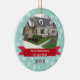 First holiday in a new home is definitely a milestone worth celebrating. Commemorate the occasion with this easy to customize Christmas ornament. This memento features your photo with custom text on a color banner. Photo is framed with a flurry of falling snowflakes. The back side also features the same snow flake background. Preserve your life moments with these holiday ornaments.