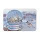 Inside a snow globe is a winter landscape with a cottage overshadowed by bare maple and cherry trees. Snow glitters on the lawn, holly bushes covered with bright red berries flank the door, and snowflakes tumble through the frozen air. Beside the globe a little chickadee looks curiously in at the miniature scene.