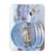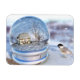 Inside a snow globe is a winter landscape with a cottage overshadowed by bare maple and cherry trees. Snow glitters on the lawn, holly bushes covered with bright red berries flank the door, and snowflakes tumble through the frozen air. Beside the globe a little chickadee looks curiously in at the miniature scene.