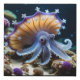 This is a photo realistic image of a purple and orange octopus with white snowflakes on its tentacles. The octopus is in a coral reef setting with various coral and fish in the background. The snowflakes are white and six-pointed. The image has a festive and whimsical feel to it.