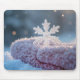 A delicate snowflake ornament rests on a soft, plush pink mitten with a dreamy winter backdrop softly illuminated by diffused light