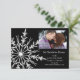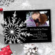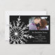 Customize the festive Snowflake on Black Winter Wedding Save the Date Announcement Flat Card with the personal names of the couple, picture and marriage ceremony date to announce your December, January or February winter wonderland theme nuptials. This elegant custom wintery marriage keep the date card features an intricate faux beveled white snowflake adorning the corner with a black background. Available as a printed invitation for mailing or as a digital download for easy sharing digitally online.