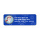 Holiday return address labels with a Santa Claus and blue background with snowflakes and white text that's easy to customize.