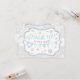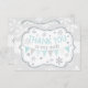 Silver glitter-look snowflake and border with grey and white snowflake print background and grey polka-dot band and blue bunting banner thank you card.