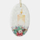 Festive red bow, a watercolor yellow candle, holly berries, fir twigs, and white flowers over white snowflakes background