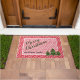 This design starts with a pattern of white snowflakes on a red background. There's a white overlay and text that reads Merry Christmas and the Wilson Family. In the lower right corner there are three evergreen trees with snow. Text can be customized.