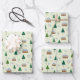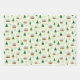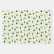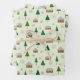 Wrapping paper with a pattern made of snowflakes falling over fir and pine trees, and small houses.