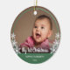 This keepsake Christmas ornament features a photo of baby and is framed with a green circle and is accented with white snowflakes. White script text reads: My First Christmas. Custom text allows you to personalize with baby's name and year.