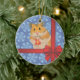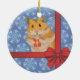 Cute Christmas Hamster design, perfect for the holiday season. This cute hamster is standing behind a red ribbon and bow, and there is a snowflake pattern. Background is blue.