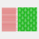 Snowflakes, Christmas trees and red stripes three tone green Wrapping Paper Sheets with red Christmas wishes. One sheet displays a cute pattern of snowflakes and red white stripes. The second features snow and the third white trees on different shades of green. There also is the text "Merry Christmas" in red on all sheets. Personalize it with your text.