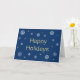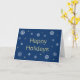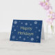 A classic and timeless holiday card for anyone! Happy Holidays in gold. White and gold snowflakes. Dark blue background. The inside of the card is blank.