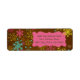 Snowflakes on Brown holiday return address labels with lots of snowflakes of pink, yellow, and blue on a brown background and a pink frame where you can add your name and address before ordering.