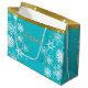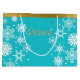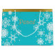 Elegant holiday gift bag done in robin's egg blue, with a gold border, around the top of the bag. Graphics of white snowflakes and gold dots, decorate both sides of the bag, with gold tone graphic text reading Peace. Customize to add your own text to this lovely holiday bag.
