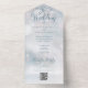 All in one winter wedding invitation featuring snowflakes on a winter frost background. The invitation includes a perforated RSVP card that’s can be individually addressed or left blank for you to handwrite your guest's address details. Designed by Thisisnotme©
